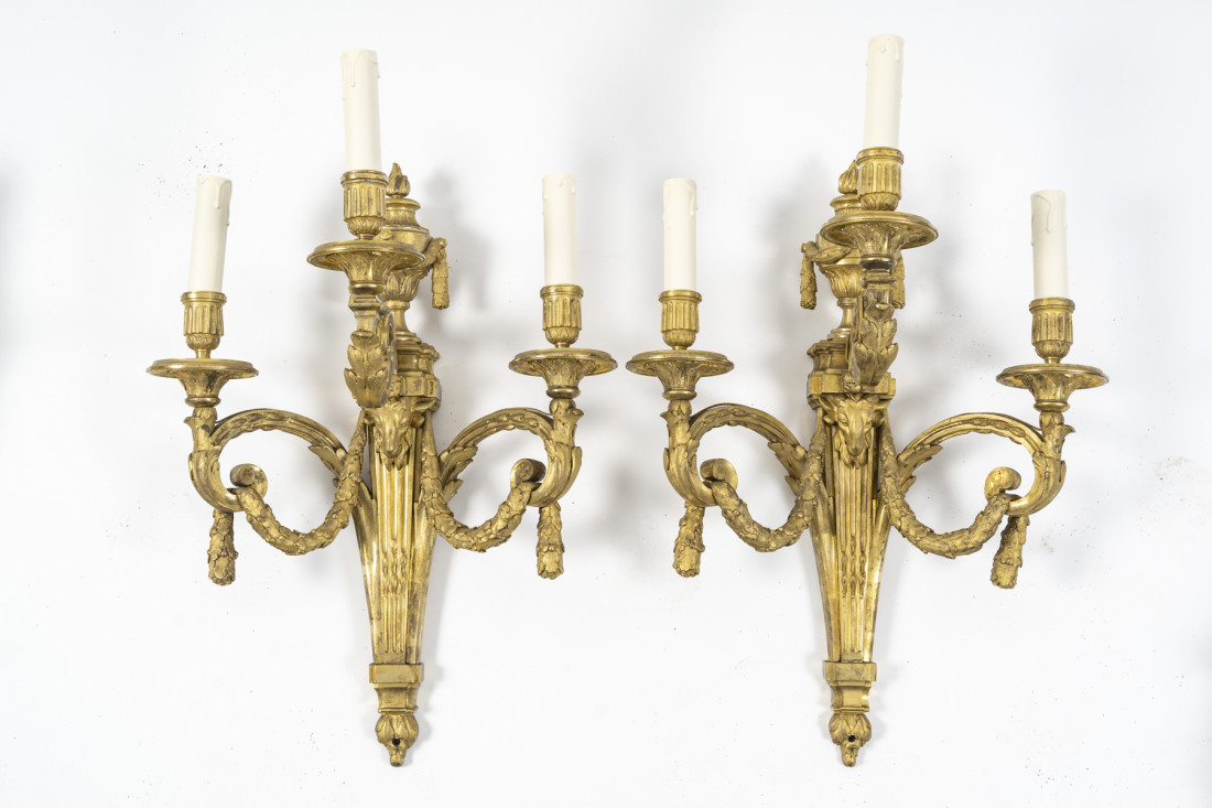 Pair of gilt bronze sconces with three light arms, Louis XVI period (1774 - 1793).