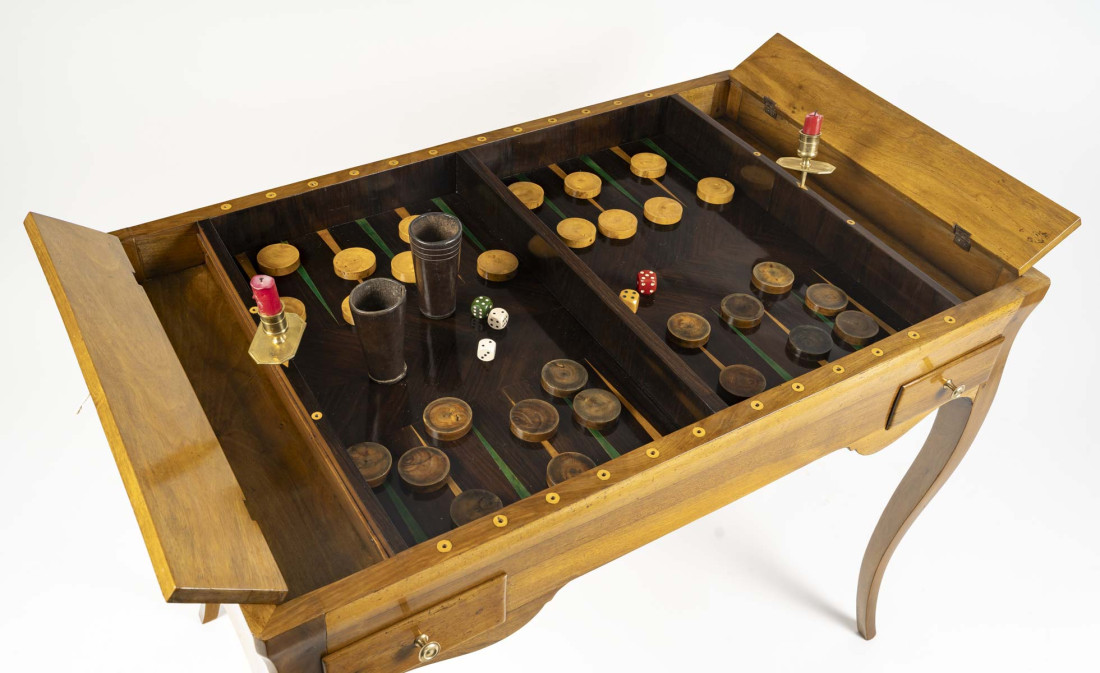 A Louis XV period backgammon table in fruitwood and ebony marquetry, resting on cabriole legs and opening with two opposing drawers in the frieze. The removable top is covered in felt, the reverse side with a chessboard. The table includes a complete set of 30 chips and a chessboard, two leather cups, a set of dice, and two candlesticks.