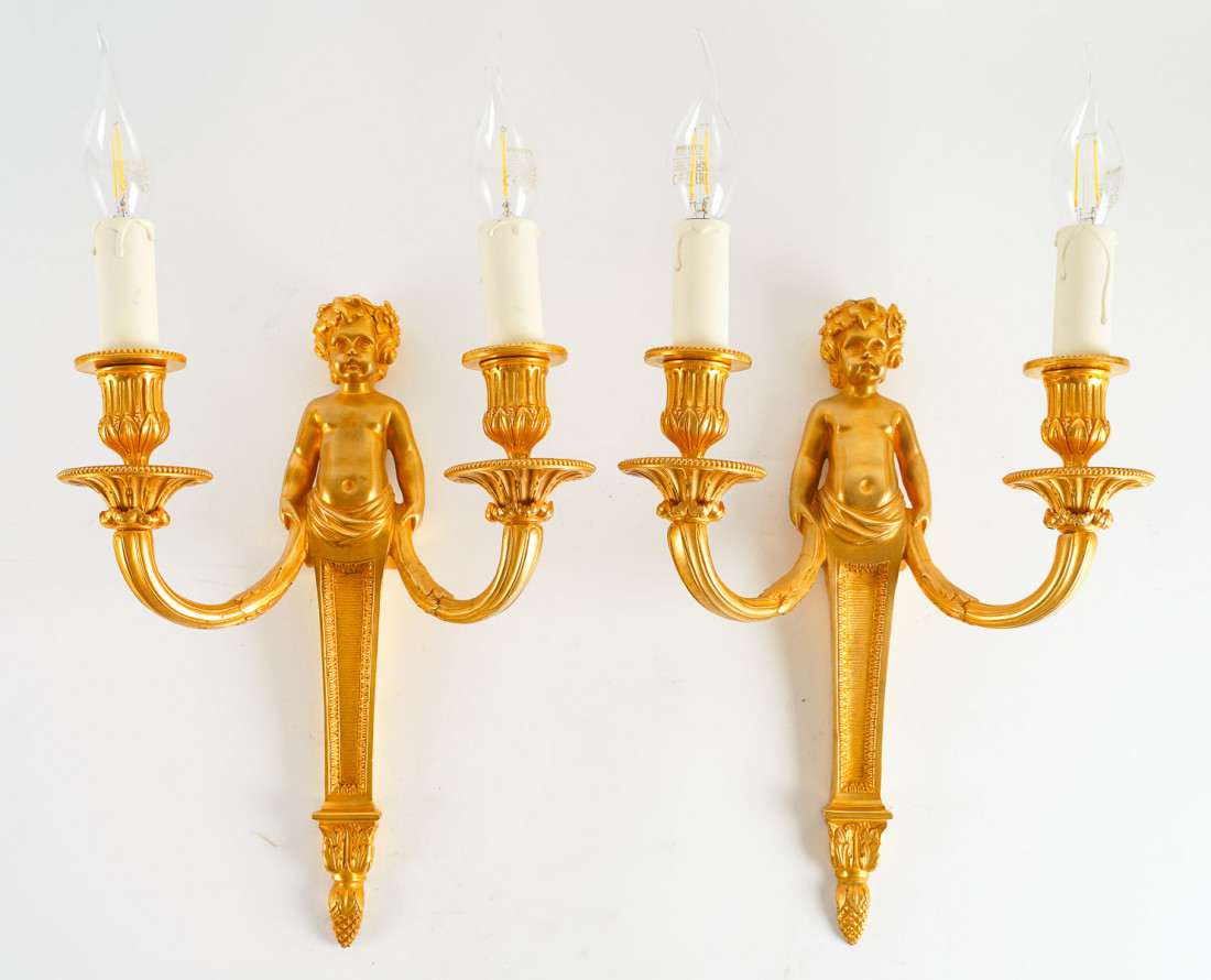 A pair of delicately chiselled gilt bronze two lights scones in Louis XVI style in shape of putto bearing a crown of wine leaves and holding two arms of light decorated with leaves and corns. The lower part of scones is decorated with leaves and finishing with a pine cone. Original gilding.