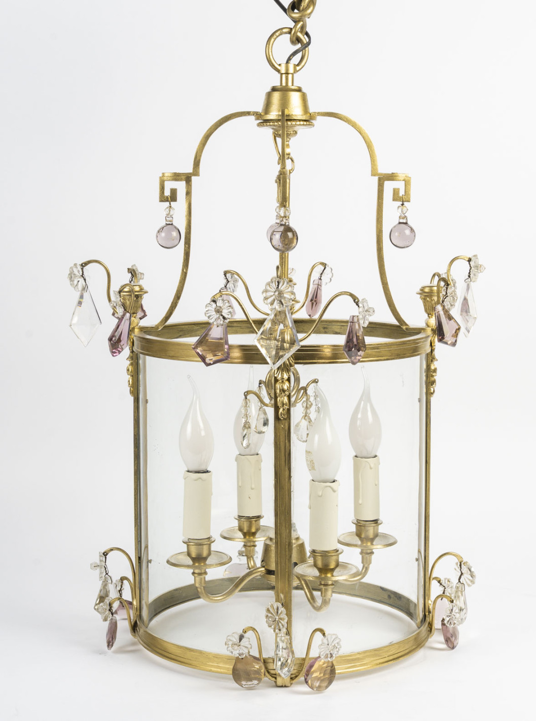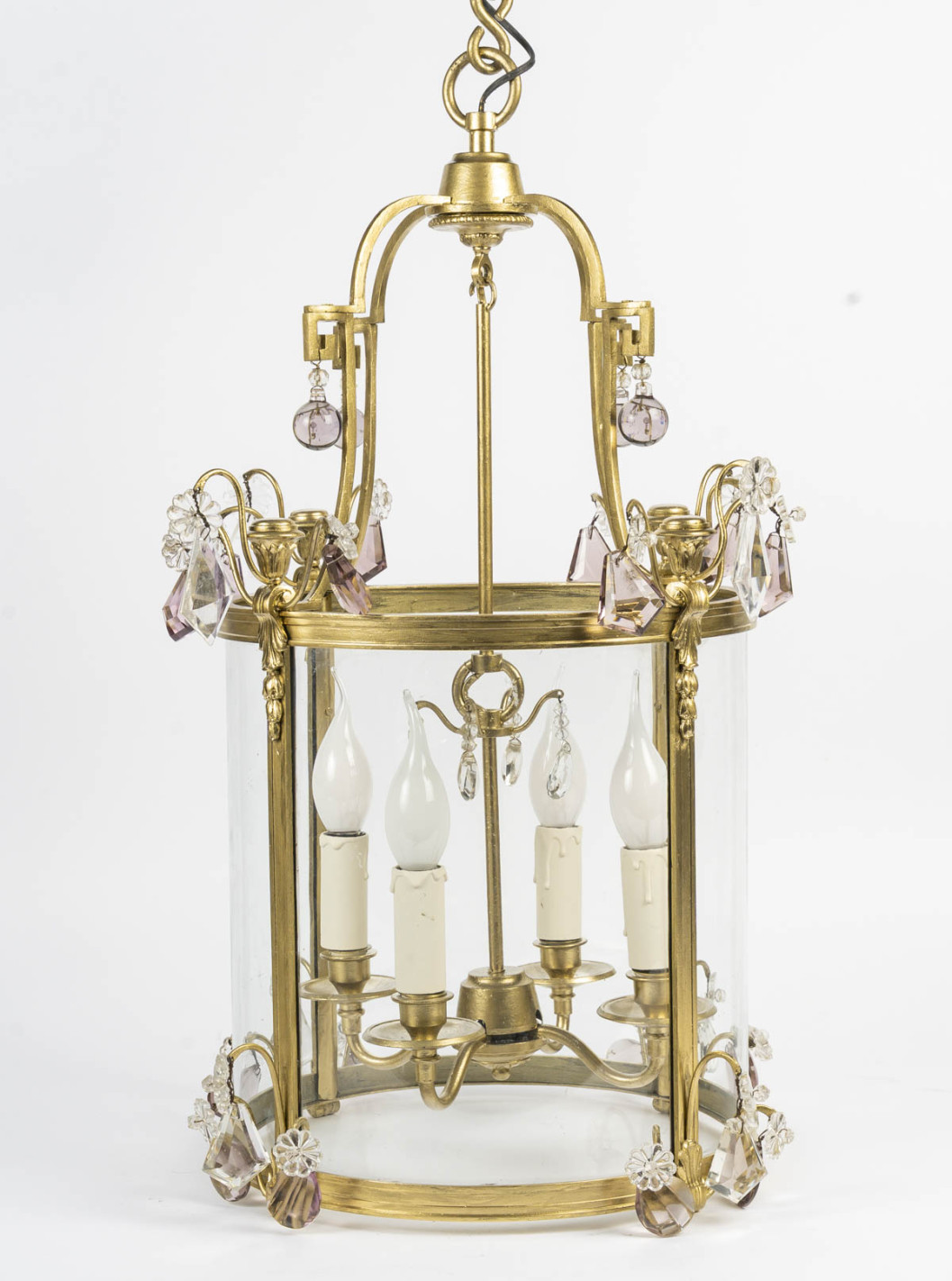 Lanterne à vitre galbée en bronze doré et cristal à quatres bras de lumières de style Louis XVI, d'époque XIXème.