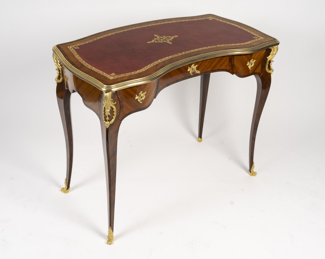 Elégant bureau de dame de forme rognon en placage de bois de rose et palissandre ouvrant en façadeà trois tiroirs de style Louis XV, d'époque Napoléon III (1848-1870).
