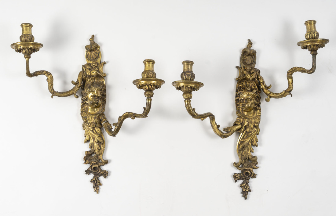 Paire d'appliques en bronze doré et ciselé à deux bras de lumière assymétriques, de style Régence, d'Epoque Napoléon III.