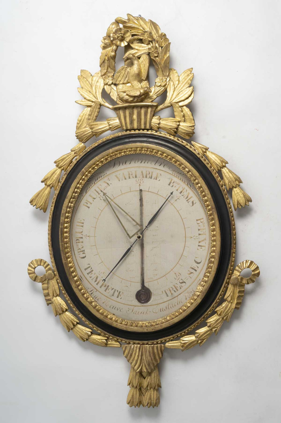 Baromètre en bois sculpté et doré d'époque Louis XVI décoré à son amortissement deux colombes, symbole de l'amour, entourées d'une couronne de laurier agrémentée de petites fleurs.