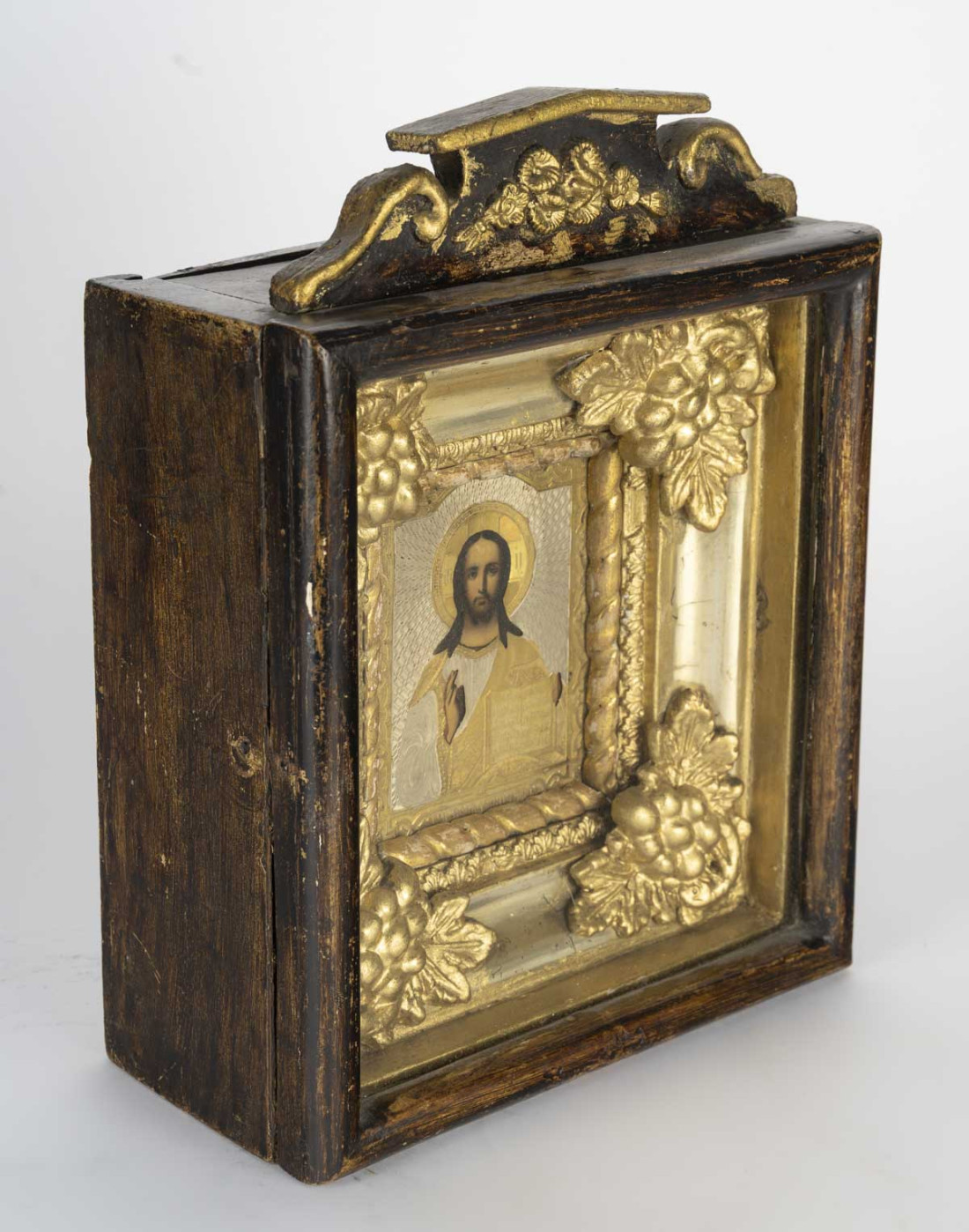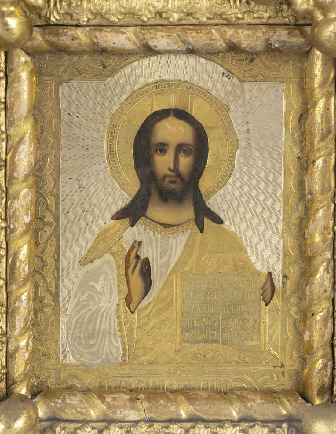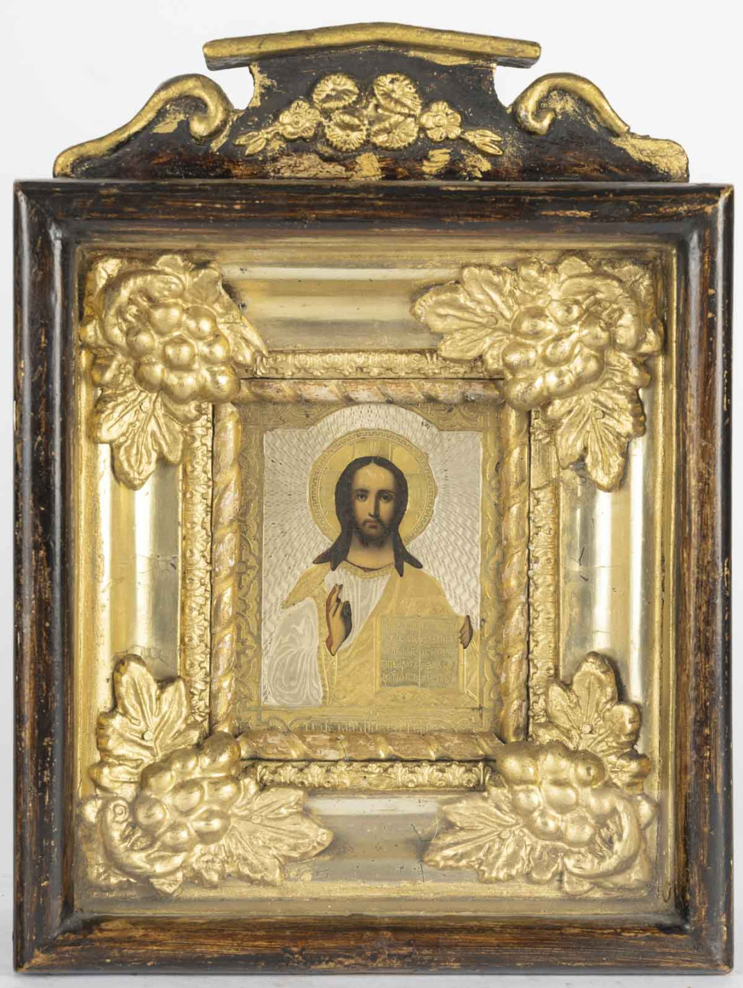 Tempéra sur panneau dans une riza finement ciselée et argentée dans un beau kiot aux motis sculptés de fleurs dans les angles.