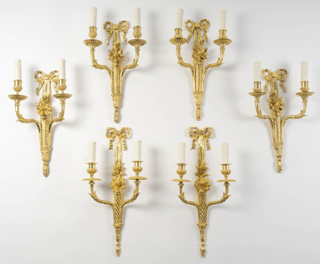 Rare suite de 6 appliques de style Louis XVI en bronze doré à deux bras de lumière, d'époque XIXème.