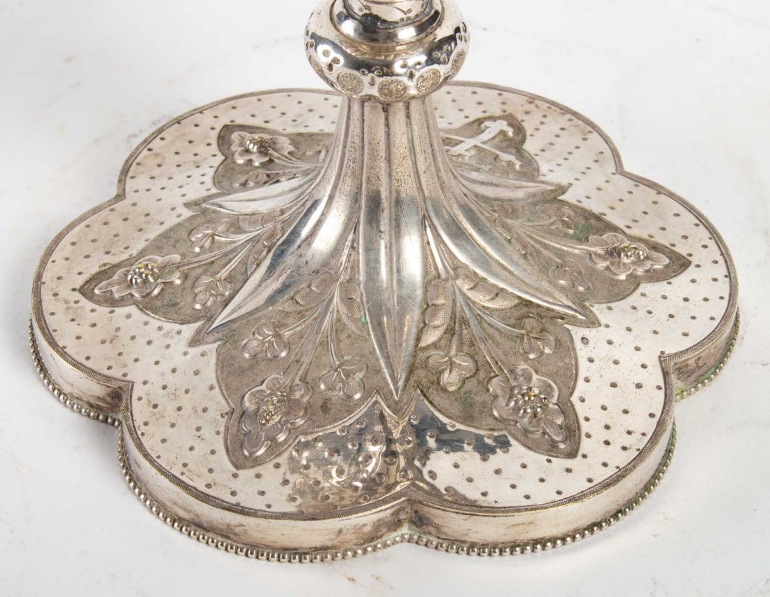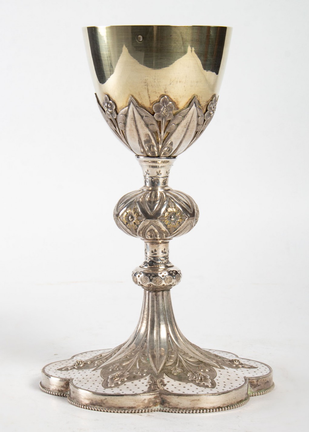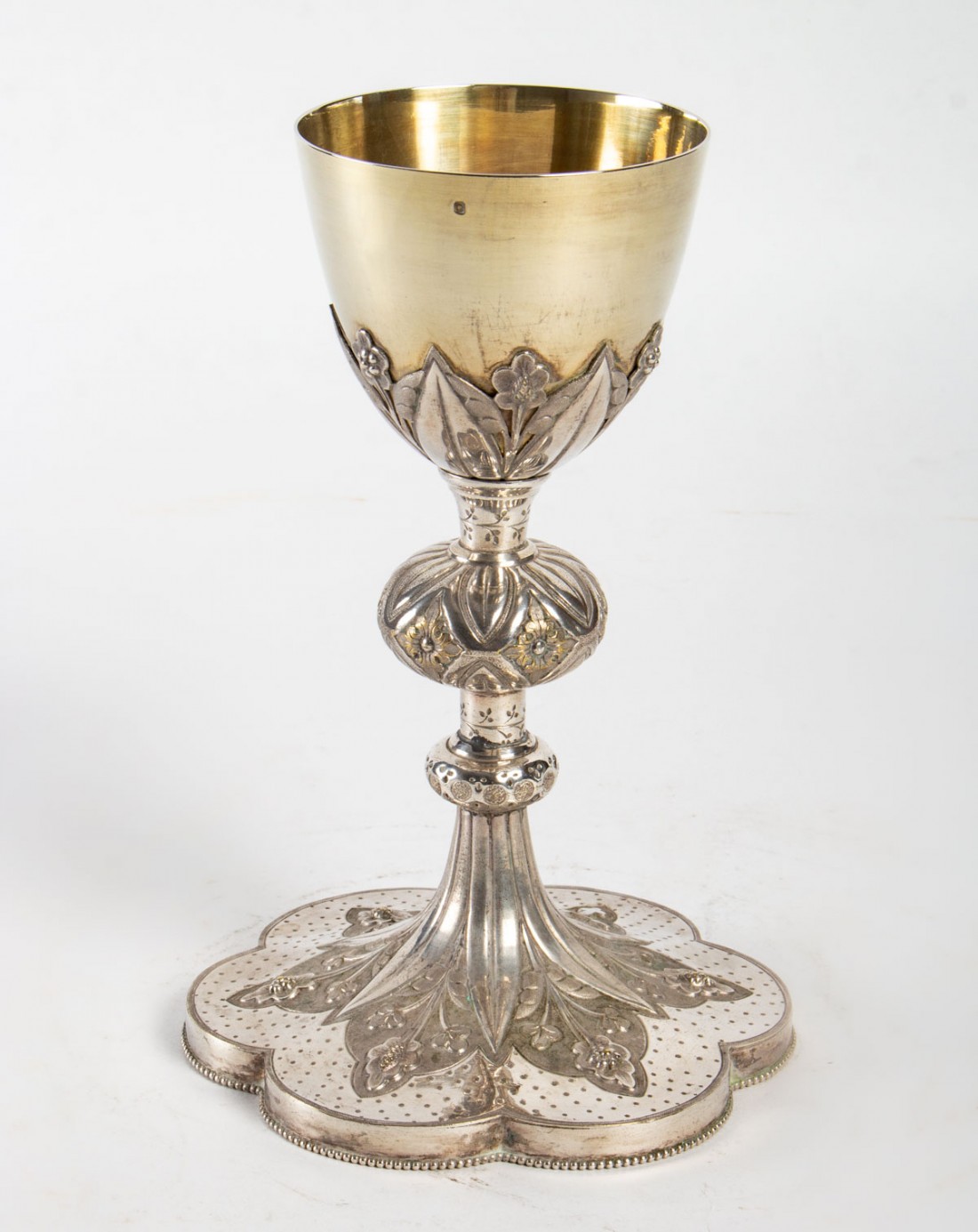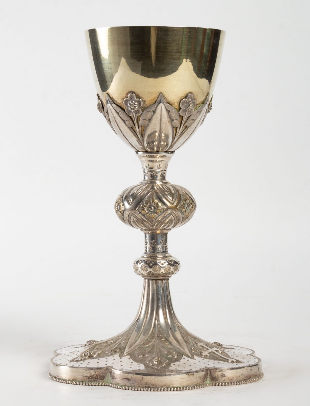 Calice à six lobes orné de fleurs, le nœud circulaire à décor végétal. La coupe lisse en vermeille (argent doré avec son poinçon) est décorée à sa base de fleurs et de feuillage.
